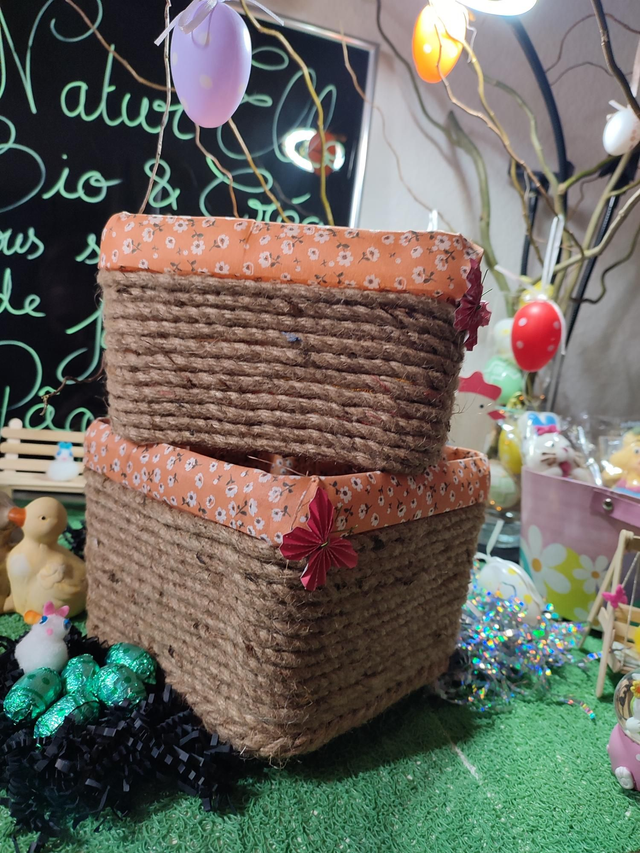 Panier de rangement pour salle de bain en matériaux de récupération, seau en plastique, tissus et corde de jute.